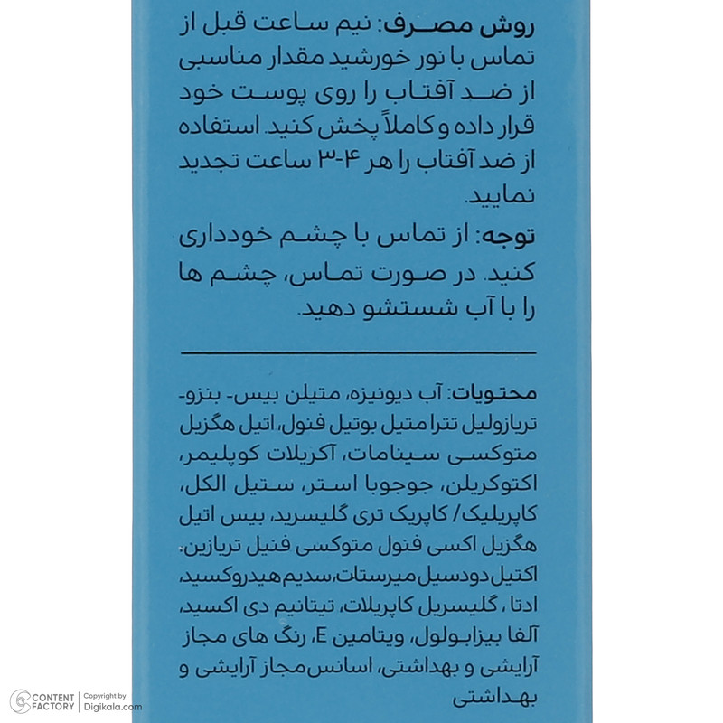 راهنمای استفاده : نیم ساعت قبل از تماس با نور خورشید مقدار مناسبی از ضد آفتاب را روی پوست خود قرار داده و کاملا پخش کنید. استفاده از ضد آفتاب را هر4-3 ساعت تجدید نمایید.