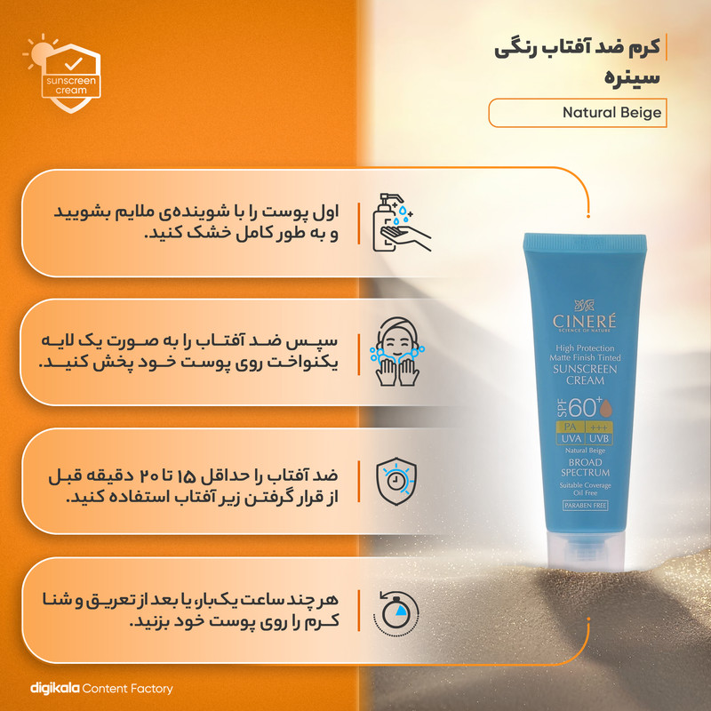 کرم ضدآفتاب سینره با SPF 60، به دلیل کیفیت بالا و ویژگیهای منحصربهفردی که دارد، گزینهای مناسب برای افرادی است که به دنبال محافظت کامل از پوست خود در برابر اشعههای مضر خورشید هستند. این کرم نه تنها از پوست شما در برابر آفتاب محافظت میکند، بلکه با رنگ طبیعی خود، به یکنواختی و زیبایی ظاهر شما نیز کمک میکند. رنگ بژ طبیعی این کرم، به گونهای طراحی شده است که به خوبی با تنوع رنگ پوستها سازگار باشد و پوششی یکنواخت و طبیعی بر روی پوست ایجاد کند. این ویژگی به کاربران امکان میدهد تا از این کرم به عنوان یک پایه آرایشی نیز استفاده کنند، به طوری که علاوه بر محافظت در برابر آفتاب، پوستی یکنواخت و بدون نقص داشته باشند. ترکیب رنگ بژ طبیعی در این کرم، به گونهای است که نواقص کوچک پوستی را پوشش داده و ظاهری صاف و یکدست به پوست میبخشد. با توجه به فرمولاسیون بدون چربی و پارابن، این محصول مناسب انواع پوستها از جمله پوستهای حساس، چرب و مستعد آکنه بوده و میتوان از آن به صورت روزانه و مداوم استفاده کرد.