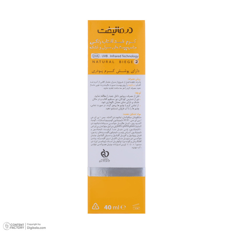 کرم ضدآفتاب درمالیفت، با محفظه پلاستیکی و فرمولاسیون پیشرفته خود، گزینهای مطمئن و کاربردی برای بانوانی است که به دنبال محافظت کامل از پوست خود هستند. این محصول، نه تنها از پوست در برابر آسیبهای ناشی از آفتاب محافظت میکند، بلکه با ترکیبات مرطوبکنندهاش، پوست خشک را تغذیه و نرم میکند. با حجم 40 میلیلیتر و وزن 50 گرم، این محصول سبک و قابل حمل بوده و به راحتی در کیف دستی جای میگیرد، تا بتوانید در هر زمان و مکان از آن استفاده کنید. ویژگی ضد آب بودن کرم ضدآفتاب درمالیفت، آن را برای روزهای گرم و فعالیتهای بیرون از منزل ایدهآل میکند، به طوری که در برابر تعریق و آب مقاوم است و محافظت طولانیمدتی ارائه میدهد. به طوری که محافظت کامل از پوست شما در برابر اشعههای UVA و UVB با استفاده از کرم ضدآفتاب درمالیفت تضمین شده است.