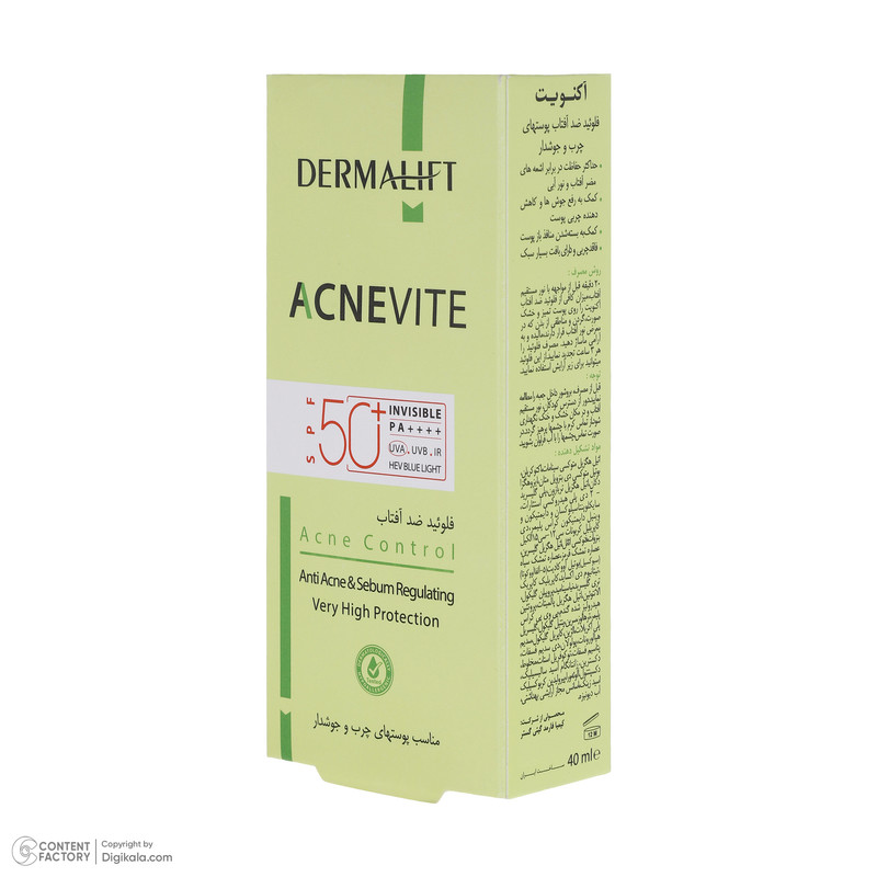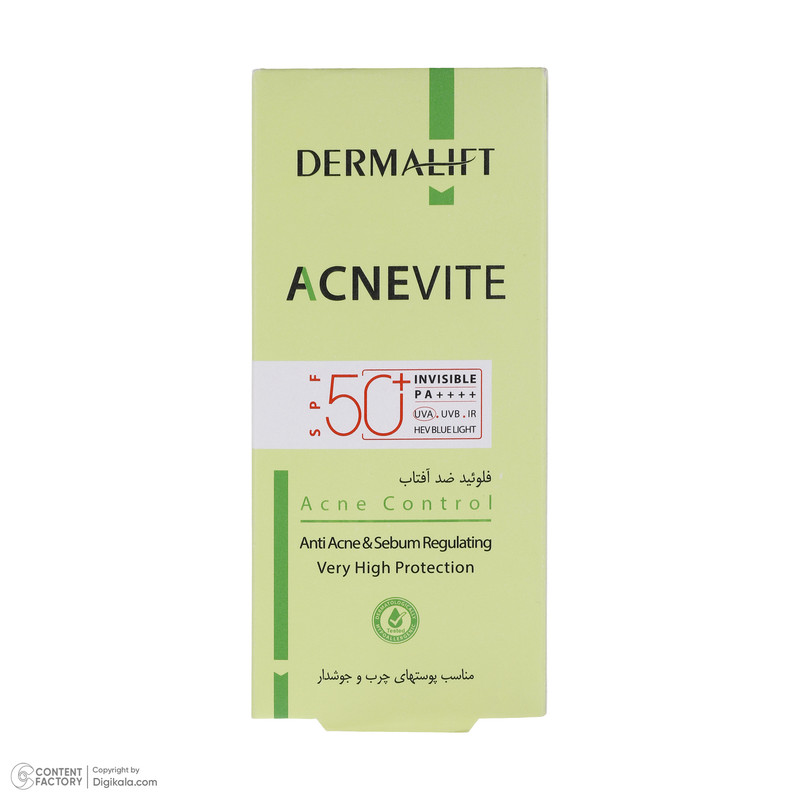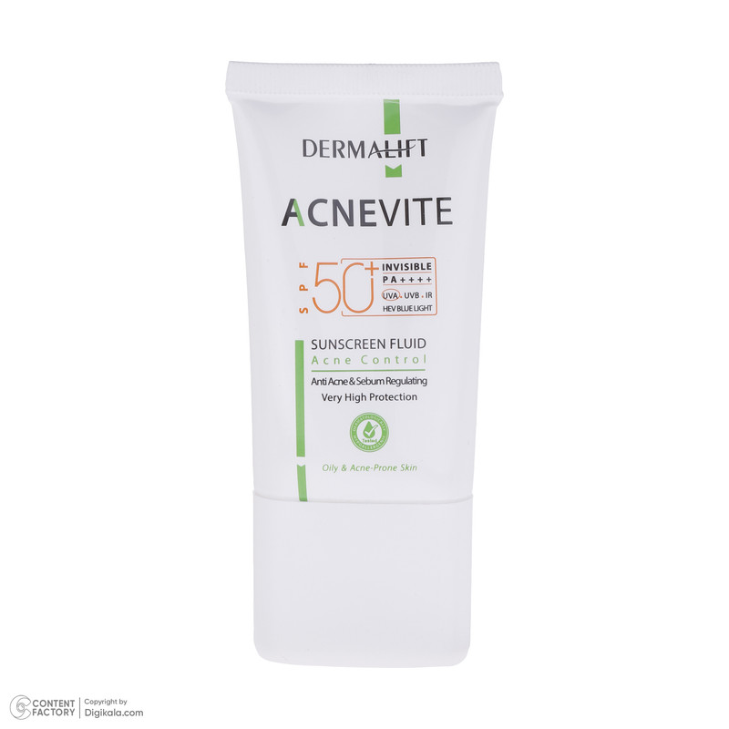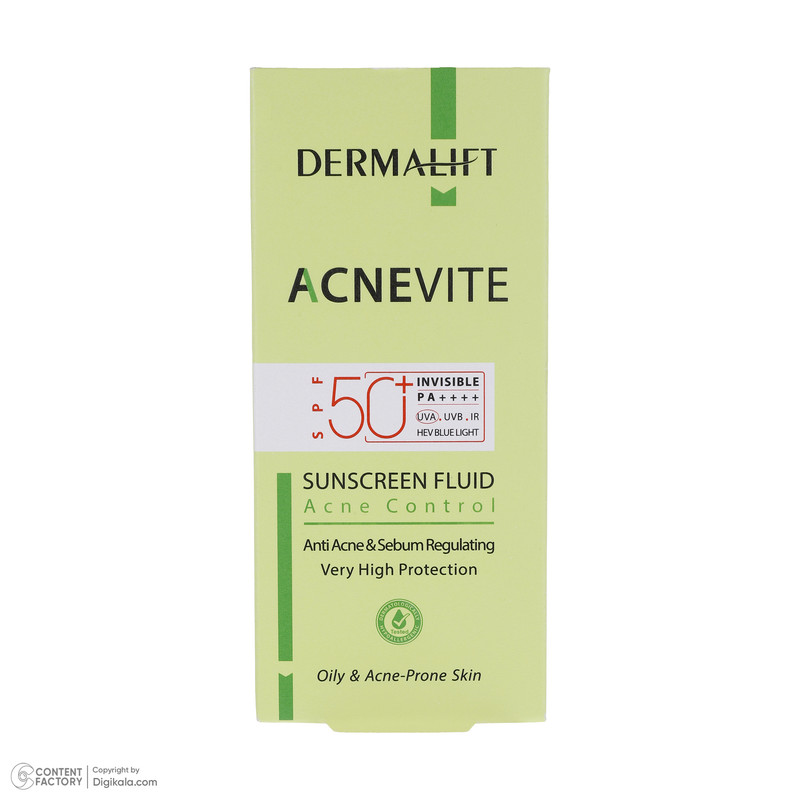 فلوئید ضد آفتاب آکنویت SPF50 درمالیفت قادر است به طور همزمان اشعههای UVA و UVB و مادون قرمز و همچنین نور آبی را به طور کامل فیلتر نموده و مانع از رسیدن آن به سطح پوست میشود. فیلترهای به کار رفته در این محصول از نوع PHOTOSTABLE است و در مواجهه با نور خورشید ماندگاری بیشتری دارد و قدرت خود را تا مدت زمان زیادی حفظ مینماید. خوشبختانه بافت فلوئید آن نیز که بر خلاف کرم سبک است، جذب محصول را بالا برده است.