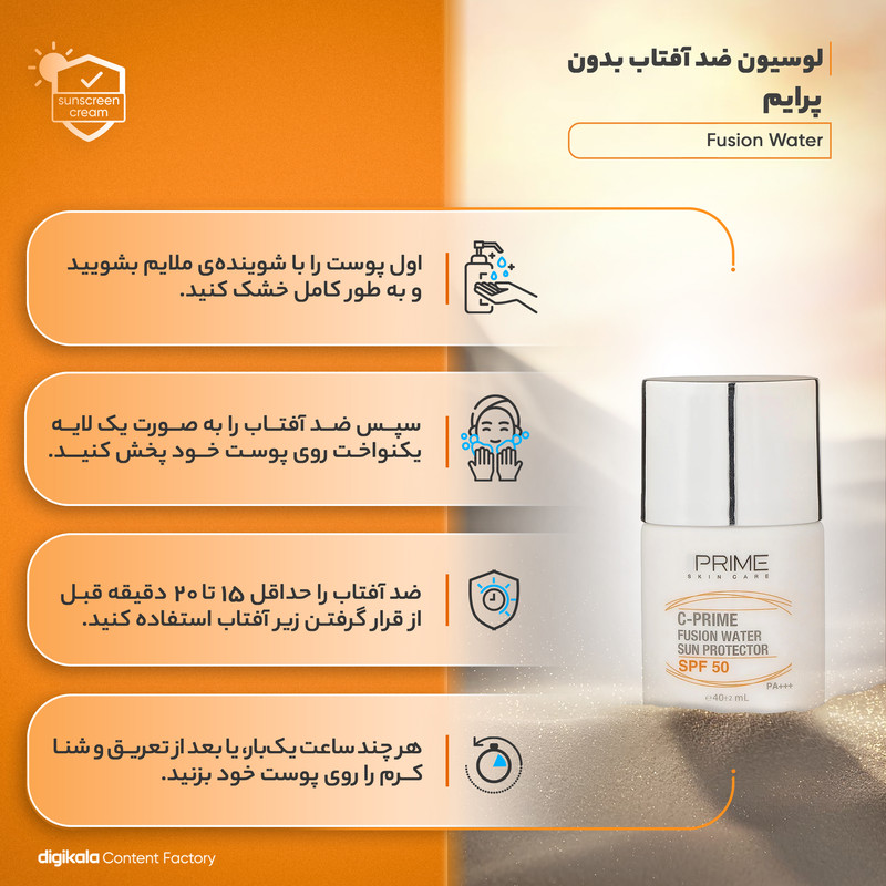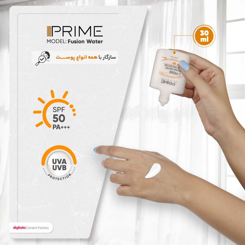 لوسیون ضدآفتاب بیرنگ پرایم با فرمولاسیون ضد آفتاب فیزیکی، محافظت کاملی از پوست در برابر اشعههای مضر UVA و UVB ارائه میدهد. این محصول با SPF 50 و PA+++، از پوست در برابر آسیبهای ناشی از نور خورشید محافظت میکند. بافت سبک و بدون رنگ این لوسیون، برای انواع پوستها مناسب است و به راحتی جذب میشود. ترکیبات این لوسیون شامل عصارههای طبیعی آفتاب گردان، گل مغربی و آلوئه ورا است که به مرطوبکنندگی و تغذیه پوست کمک میکنند. این محصول فاقد پارابن و چربی است و از ایجاد جوش و کومدون جلوگیری میکند. ویژگیهای ضد آب این لوسیون، آن را به انتخابی عالی برای استفاده در روزهای گرم و مرطوب تابستانی تبدیل میکند. این لوسیون با بافت سبک و جذب سریع، بدون ایجاد حس سنگینی یا چسبندگی، به راحتی روی پوست پخش میشود و محافظتی کامل و موثر را فراهم میکند. این محصول مناسب برای بانوان است و میتواند به راحتی در روتین روزانه مراقبت از پوست جای بگیرد.