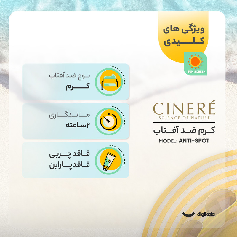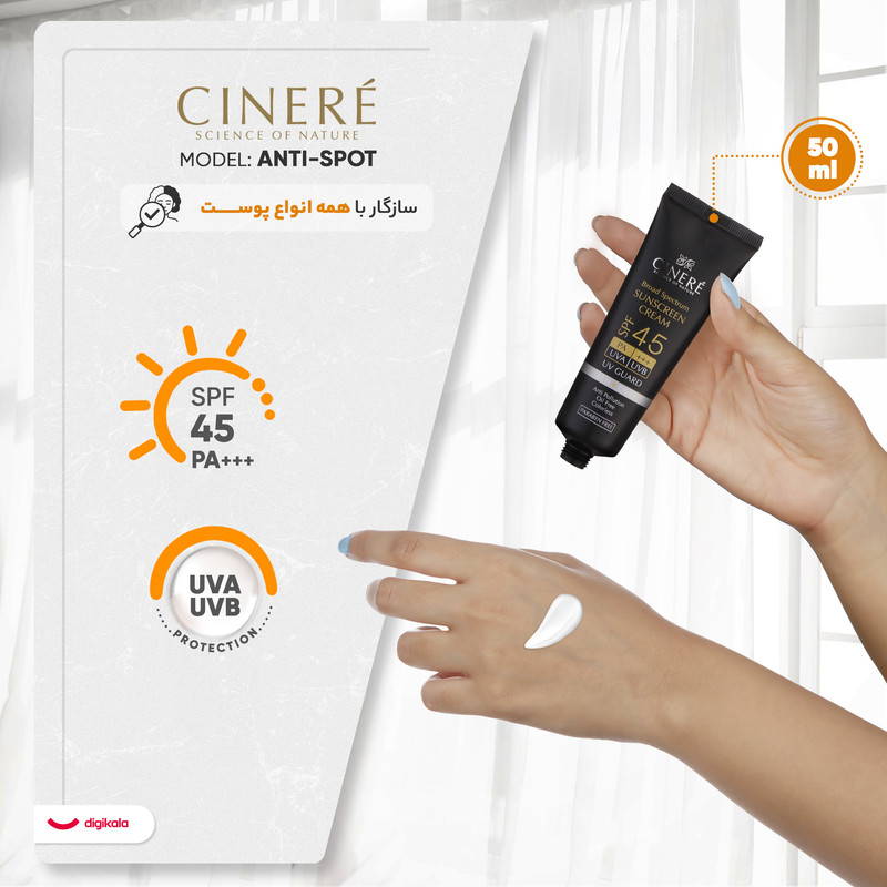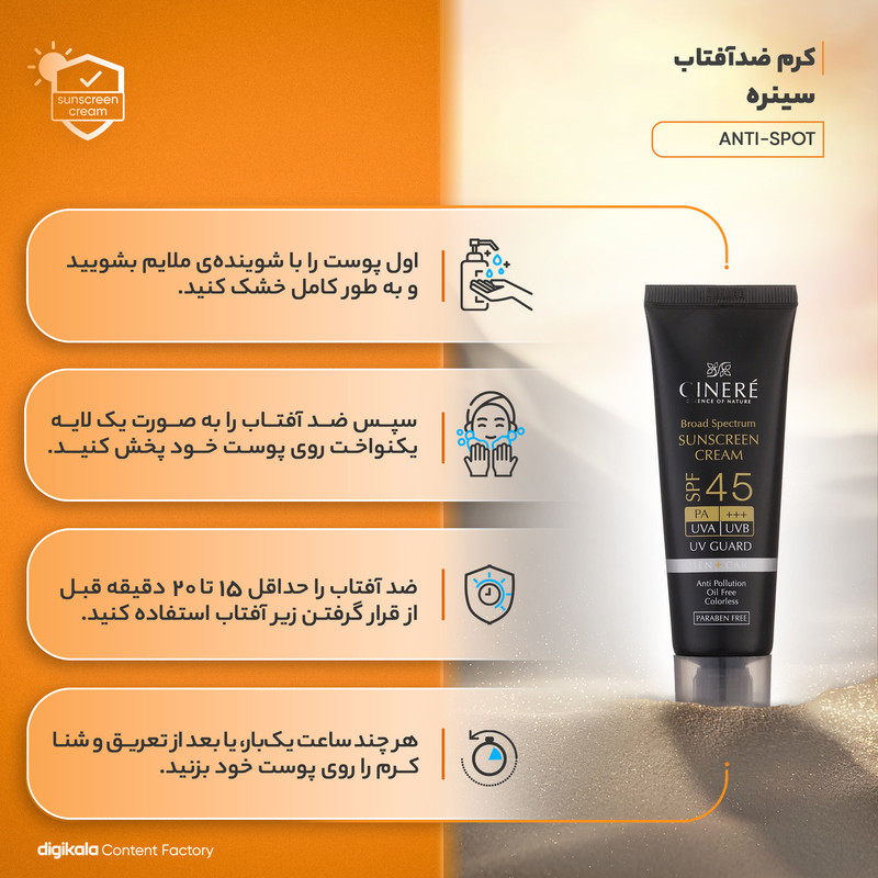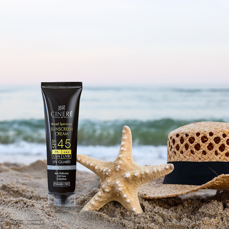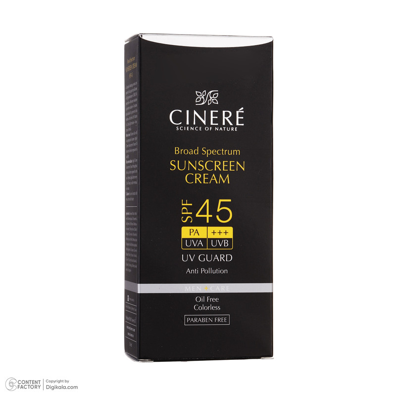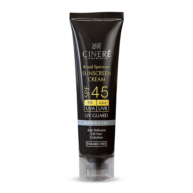 کرم ضد آفتاب «سینره» (Cinere) SPF45 با دارابودن فاکتور حفاظتی بالا علاوه بر ایجاد محافظت کامل و طولانی مدت در برابر تابشهای مضر مانند UVB، از پوست آقایان در برابر کلیه طول موجهای اشعه UVA به طور کامل محافظت مینماید. از آنجا که آقایان ساعات بیشتر روز خود را در بیرون از منزل میگذرانند و در معرض تابش نور خورشید، آلودگی هوا و سایر آلودگیهای محیطی هستند، در فرمولاسیون این کرم علاوهبر فیلترهای ضد آفتاب از عصاره مورینگا جهت محافظت از پوست در مقابل آلودگی هوا استفاده شده است. کرم ضد آفتاب SPF 45+ «سینره» (مخصوص آقایان) دارای ساختاری بسیار سبک است و بر روی پوست حالت چرب و براق ایجاد نمیکند. نوع SPF به پوست ومحل زندگی شما بستگی دارد. معمولا برای پوستهای چرب و یا پوستهای حساس ضد آفتاب با SPF پایین را پیشنهاد میکنیم و اگر پوست خشکی داشته باشید می توانید از SPF بالا استفاده کنید. البته این نکته بستگی به نوع استفاده شما هم دارد. اگر برای استفاده روزمره باشد، بهتر است از کرم ضد آفتاب اس پی افهای پایینتر استفاده کنید. گفتنی است برای آفتاب گرفتن در کنار ساحل یا استخر SPFهای بالا توصیه میشود. حتی نسبت به فصلهای مختلف هم نوع ضد آفتاب متفاوت است.
